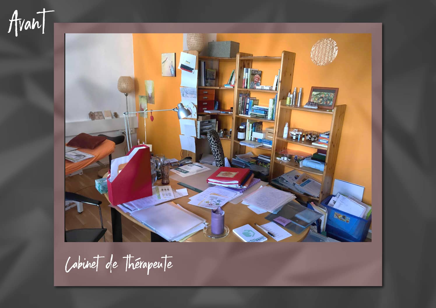 Puis par la suite, y voyant enfin plus clair, elle a émis le souhait de donner à son cabinet de naturopathie une nouvelle énergie ; elle avait également besoin de faire un grand tri dans tous les livres et la documentation accumulés depuis plus de 15 ans dans 2 espaces de son cabinet (ils sont plusieurs thérapeutes dans le même endroit).